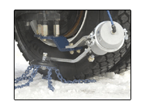 Le kit de chaînes se fixe sur le corps du pont, soit après les brides de ressort ou sur le châssis. La mise en contact avec le pneu du véhicule est assurée par le déploiement du cylindre pneumatique équipé d’un galet qui porte les chaînes.La zone de contact s’effectue sur le flan intérieur du pneu assurant une pression suffisante pour provoquer la rotation du galet ainsi les chaînes sont projetées sous le pneu avec la force centrifuge. |
